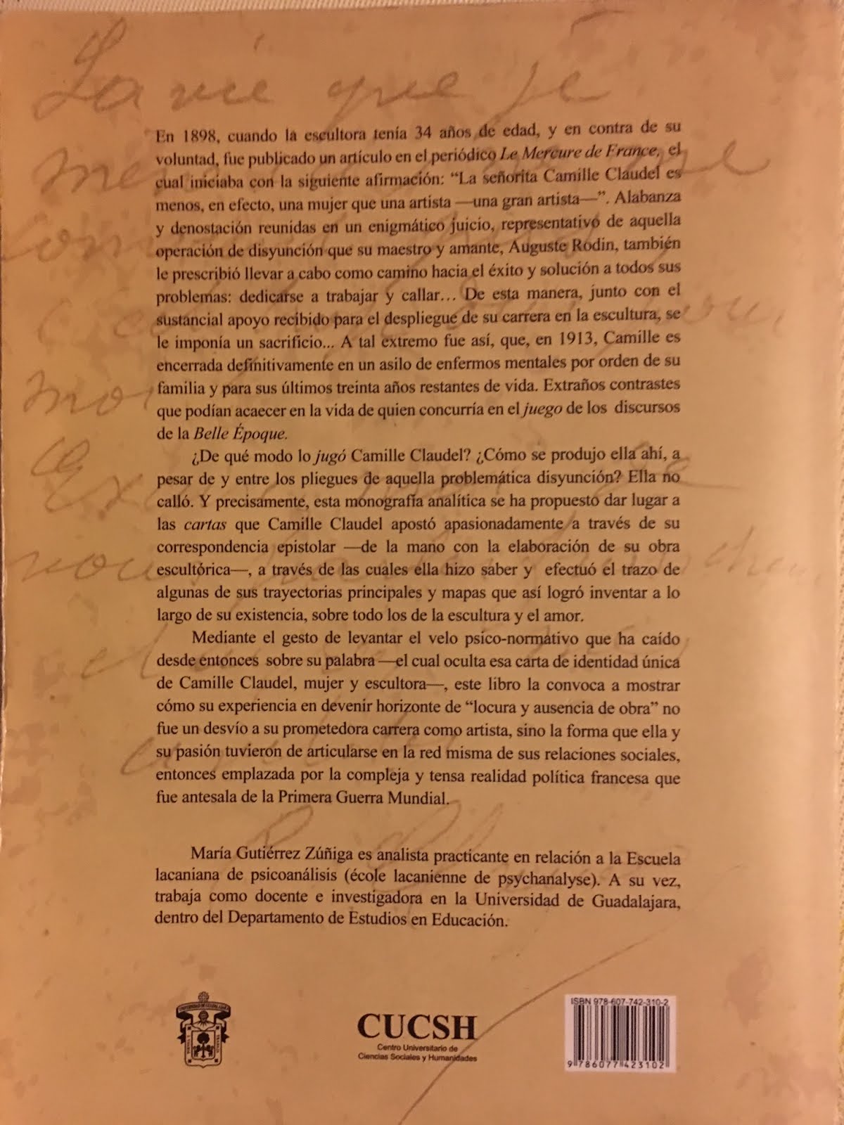 María Gutiérrez decidió llamarle a su libro sobre Camille Claudel, producto de su Tesis de Maestría, pero trabajada durante mucho tiempo y, por tanto, muy modificada, por supuesto: Vivir entre los pliegues del lenguaje de una época. Camille Claudel, mujer y escultora (1864-1943), editado por la Universidad de Guadalajara el año pasado.