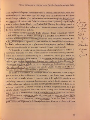 Lo primero que me gustaría decir, antes de entrar en los pliegues y repliegues (significantes) de la vida y obra de Camille Claudel, es que no estamos sólo ante una monografía, sino, más bien, ante una excelente investigación y una muy fina lectura de las cartas de Camille Claudel, para, por medio de ellas, indagar algo de la obra producida en un contexto en que el significante escultora no existía.