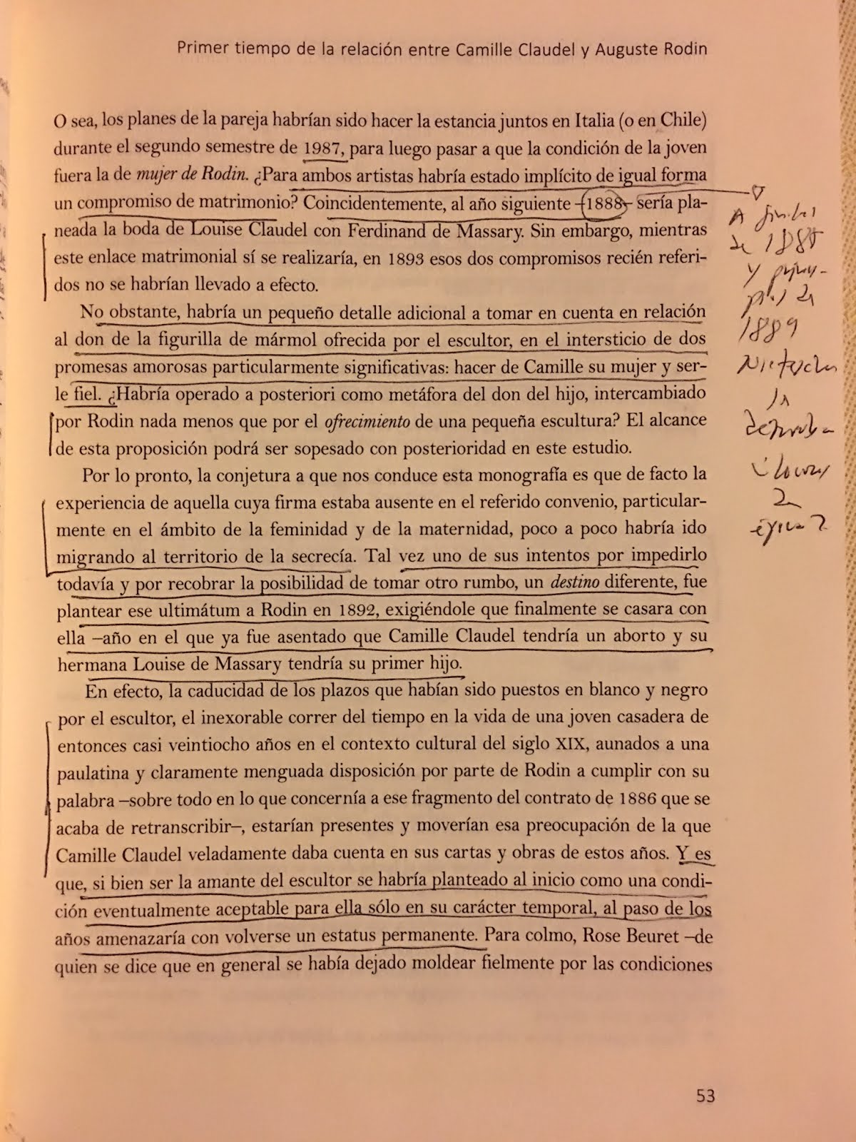 Al leer todo esto en el precioso libro de María Gutiérrez, me veo obligado más que a la indulgencia a la justicia, siempre por venir, de que este libro sea leído como lo que es: un gran aporte que va más allá de la monografía, al tiempo que honra dicho campo, para que ocupe su lugar en ese terreno tan difícil de lograr, hacer biografías, pero despiscologizando al sujeto en cuestión, en este caso Camille Claudel, para ubicarlo, insisto, en la red histórica de los significantes que lo determinaron en sus complejos avatares subjetivos, como ya lo dije.