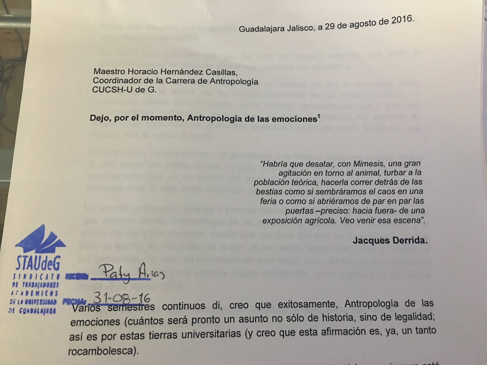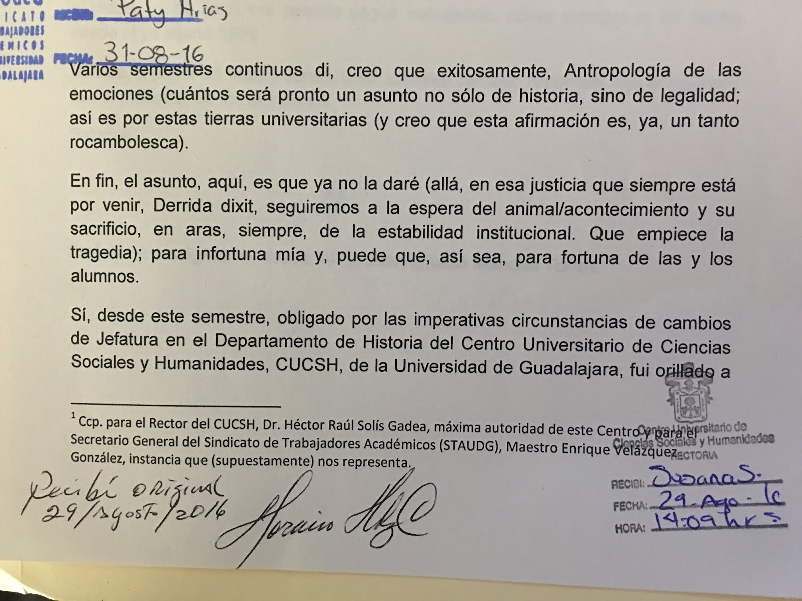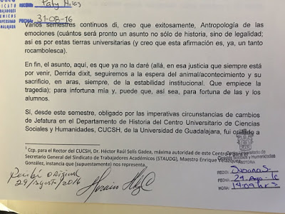 El 29 de agosto pasado, entregué el siguiente texto al Coordinador de la Licenciatura en Antropología del Centro Universitario de Ciencias Sociales y Humanidades (CUCSH), Mtro. Horacio Hernández Casillas, con copia dirigida al Rector, Dr. Héctor Raúl Solís Gadea; de igual modo, se entregó una copia dirigida al Secretario General del Sindicato de Trabajadores Académicos de la Universidad de Guadalajara (STAUdeG), Mtro. Enrique Velázquez González, esto el 31 de agosto.