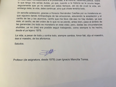 Un sencilla aclaración, gracias a Horacio Hernández Casillas por su insistencia en que siguiera dando Antropología de las emociones, aduciendo la aceptación y el cariño de las y los alumnos, cariño que me llevo (de eso no hay dudas), ya que éste, el cariño, es del orden de lo que no se pierde, antes bien, pasa al ámbito de las ganancias (no todo es monetario en esta vida); pero, dadas las circunstancias aludidas, ya no (me) era posible seguir trabajando, como siempre lo he hecho, desde el ya lejano 1978.