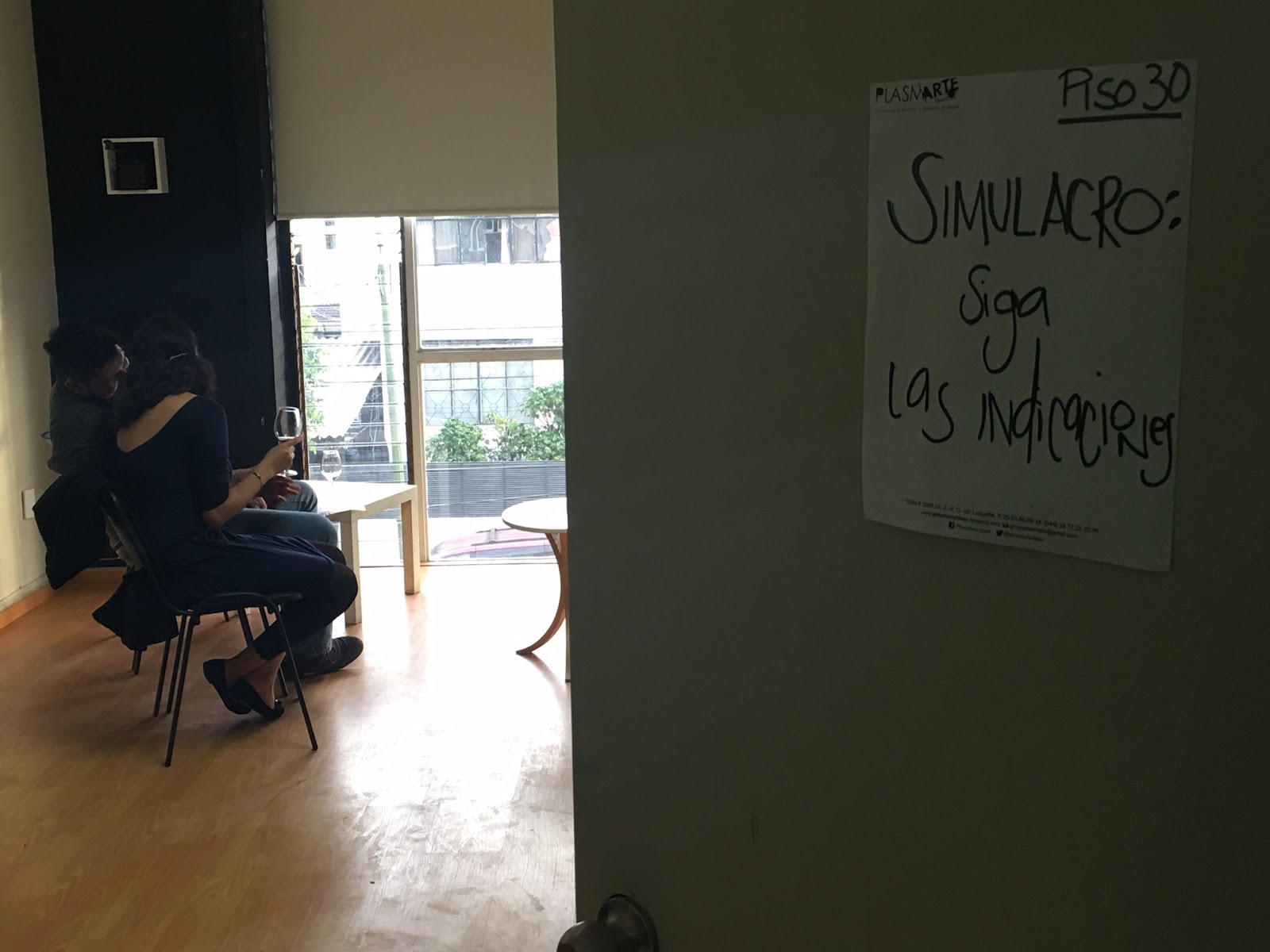 Simulacro en el piso 30 fue un experimento, en el que a través de este espacio los incluyo, que sucedió en un enorme edificio[1]. Una chica cumplió años y convirtió su aniversario en una pieza artística donde un grupo de amigos, provenientes de muy variados círculos interactuaron por cuatro horas degustando comida vegana y vino catado especialmente para la ocasión.