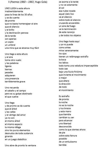 Un día antes de mi cumpleaños tuve clase con Tania, a quien en un comentario previo le había platicado sobre mi aniversario 31, ella tuvo un gran gesto al final de la clase y se acercó para regalarme un poema impreso de Hugo Gola, quien fuera maestro de la Ibero y gran influencia para muchos poetas. El poema en cuestión es el número I de su antología Poemas (1960 – 1963), hecho por Gola cuando cumplió 31. Fue así como llegó a mis manos este maravilloso presente, causando una profunda impresión, la cual me llevó a dedicar mi trabajo final para ese módulo a hablar de tal suceso.