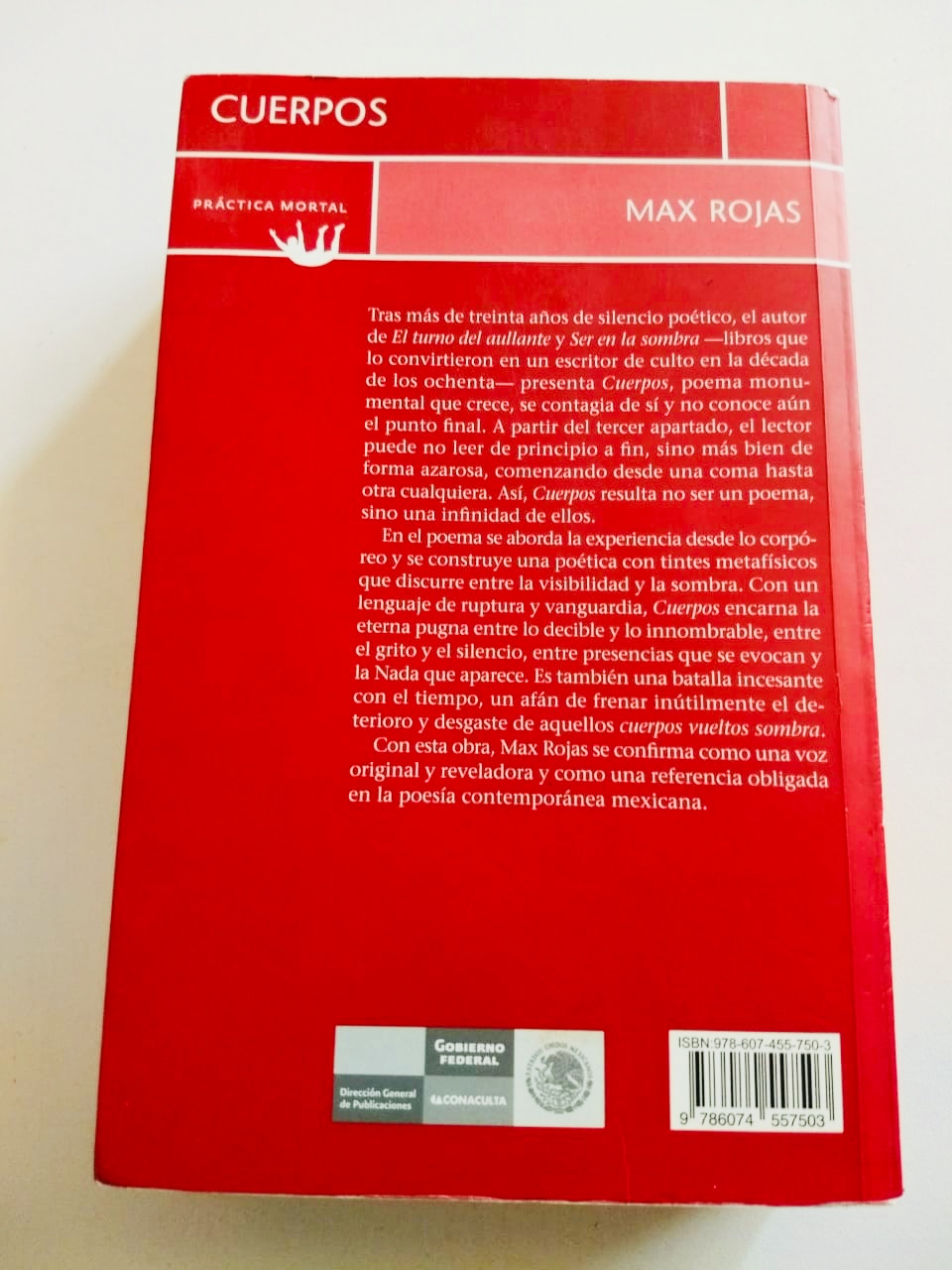 Sí, Cuerpos, publicado en 2011 por CONACULTA, es de dimensiones impactantes (651 páginas); pero no solamente eso. Al parecer Max dejó, en la memoria de una de las personas cercanas a él (Sofía Rodríguez Fernández), de que Cuerpos implicaba, más o menos, una escritura de 3 mil cuartillas; es decir, Rojas proyectó Cuerpos como un poema (inacabable) de 25 apartados (el volumen aquí referido abarca, apenas, 6 de esos apartados) y 4 volúmenes, que todo parece indicar dejó inéditos, como inacabada queda nuestra vida cuando (nos) adviene la muerte. Ella sí, todo el tiempo, en ediciones terminadas y completas, sin necesidad de revisión ni nada que se le parezca.